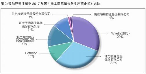 2017年,替加環(huán)素進口產(chǎn)品的市場份額為43%,下降明顯;國產(chǎn)產(chǎn)品的市場份額上升明顯,其中,江蘇豪森藥業(yè)2017年的市場份額增至27%;另一家市場份額一直在上升的國內(nèi)藥企為正大天晴,2017年市場份額占比為11%。估計這種趨勢后續(xù)將更加明顯(見圖2)。