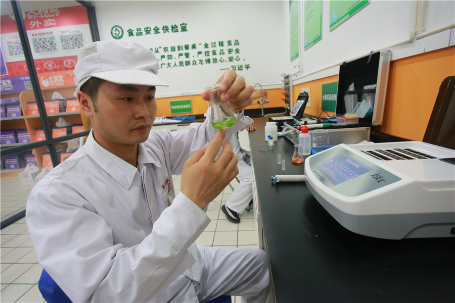 淮安大潤發(fā)超市食品安全檢驗人員進行蔬菜農(nóng)殘檢測