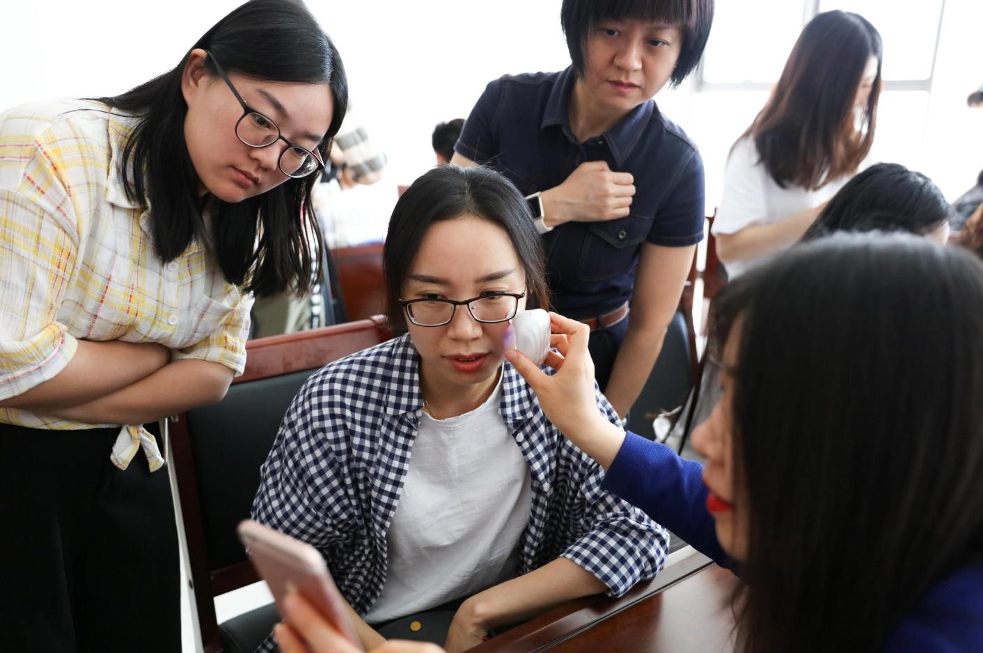 圖為玫琳凱工作人員為參加活動(dòng)的公眾做皮膚健康檢測(cè),并耐心講解皮膚日常保養(yǎng)及合理使用化妝品的相關(guān)知識(shí)。馮歡歡 攝