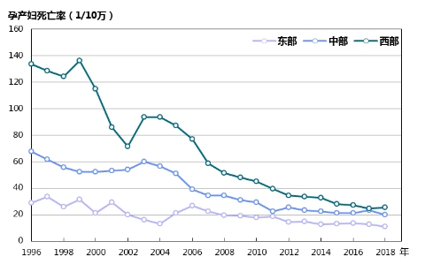 地區(qū)差距持續(xù)縮小。2018年,東、中、西部地區(qū)孕產(chǎn)婦死亡率分別為10.9/10萬、20.0 /10萬、25.2/10萬,與1996年相比,分別下降了61.9%、70.5%、81.2%。1996年西部地區(qū)孕產(chǎn)婦死亡率是東部地區(qū)的4.7倍,2018年降至2.3倍(圖3)。