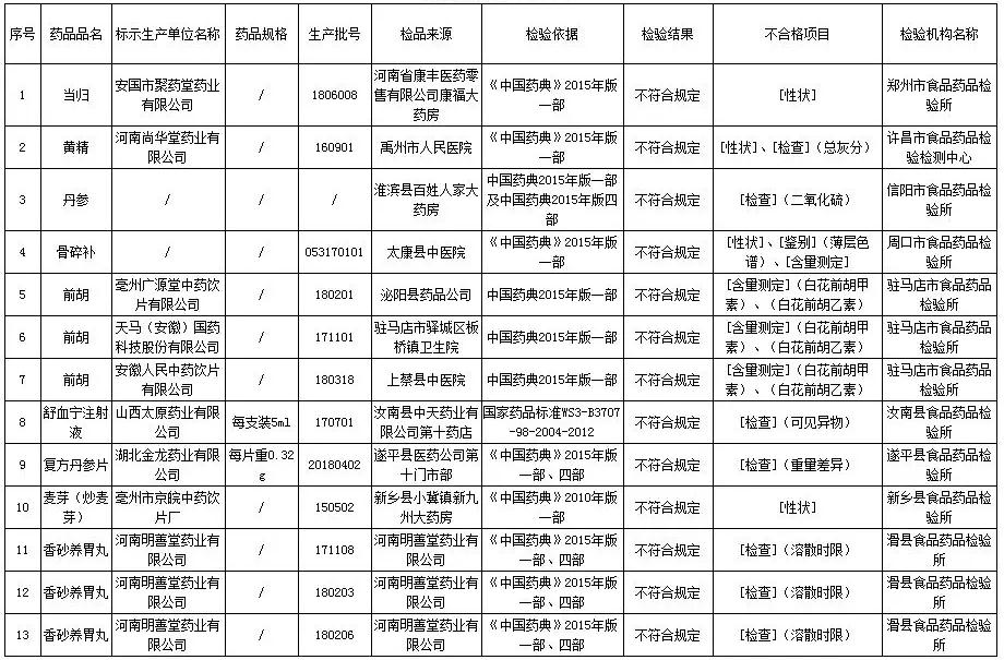 一、經(jīng)鄭州市食品藥品檢驗所檢驗,標(biāo)示為安國市聚藥堂藥業(yè)有限公司生產(chǎn)的當(dāng)歸(批號1806008)不合格,不合格項目為性狀。經(jīng)許昌市食品藥品檢驗檢測中心檢驗,標(biāo)示為河南尚華堂藥業(yè)有限公司生產(chǎn)的黃精(批號160901)不合格,不合格項目為性狀、總灰分。經(jīng)信陽市食品藥品檢驗所檢驗,檢品來源為淮濱縣百姓人家大藥房的丹參不合格,不合格項目為二氧化硫。經(jīng)周口市食品藥品檢驗所檢驗,檢品來源為太康縣中醫(yī)院的骨碎補(bǔ)(批號053170101)不合格,不合格項目為性狀、薄層色譜、含量測定。經(jīng)駐馬店市食品藥品檢驗所檢驗,標(biāo)示為亳州廣源堂中藥飲片有限公司生產(chǎn)的前胡(批號180201)不合格,標(biāo)示為天馬(安徽)國藥科技股份有限公司生產(chǎn)的前胡(批號171101)不合格,標(biāo)示為安徽人民中藥飲片有限公司生產(chǎn)的前胡(批號180318)不合格,不合格項目均為含量測定。經(jīng)汝南縣食品藥品檢驗所檢驗,標(biāo)示為山西太原藥業(yè)有限公司生產(chǎn)的舒血寧注射液(批號170701)不合格,不合格項目為可見異物。經(jīng)遂平縣食品藥品檢驗所檢驗,標(biāo)示為湖北金龍藥業(yè)有限公司生產(chǎn)的復(fù)方丹參片(批號20180402)不合格,不合格項目為重量差異。經(jīng)新鄉(xiāng)縣食品藥品檢驗所檢驗,標(biāo)示為亳州市京皖中藥飲片廠生產(chǎn)的麥芽(炒麥芽)(批號150502)不合格,不合格項目為性狀。經(jīng)滑縣食品藥品檢驗所檢驗,標(biāo)示為河南明善堂藥業(yè)有限公司生產(chǎn)的香砂養(yǎng)胃丸(批號171108、180203、180206)不合格,不合格項目均為溶散時限。
