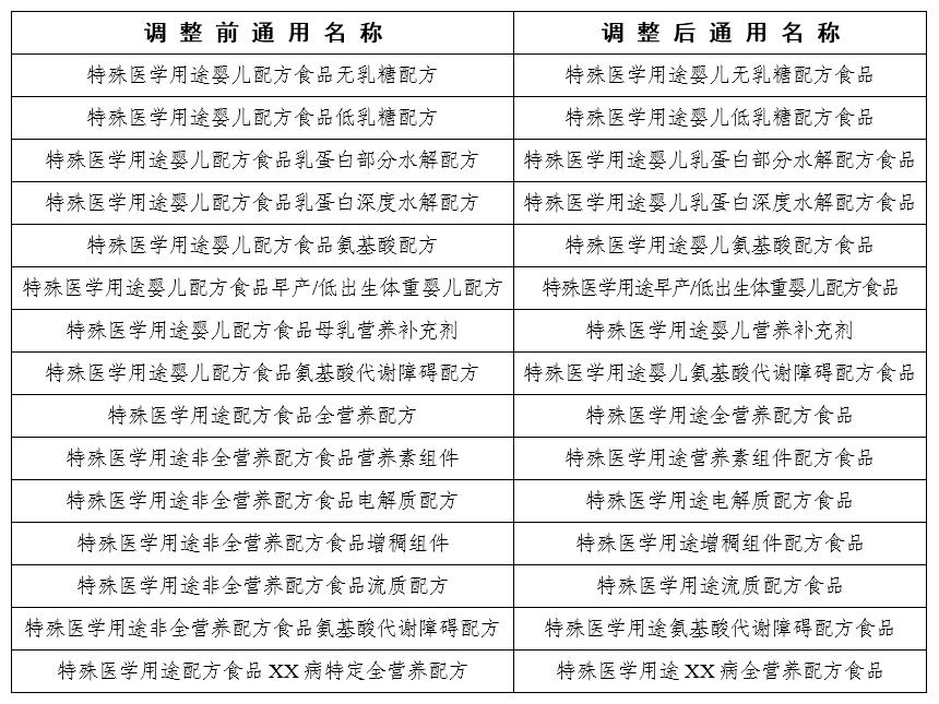 為進(jìn)一步規(guī)范特殊醫(yī)學(xué)用途配方食品的產(chǎn)品通用名稱,便于消費(fèi)者識記,避免產(chǎn)生誤導(dǎo),現(xiàn)對特殊醫(yī)學(xué)用途配方食品的產(chǎn)品通用名稱進(jìn)行調(diào)整(通用名稱調(diào)整前后對照表見附件),并就有關(guān)事項(xiàng)公告如下:
