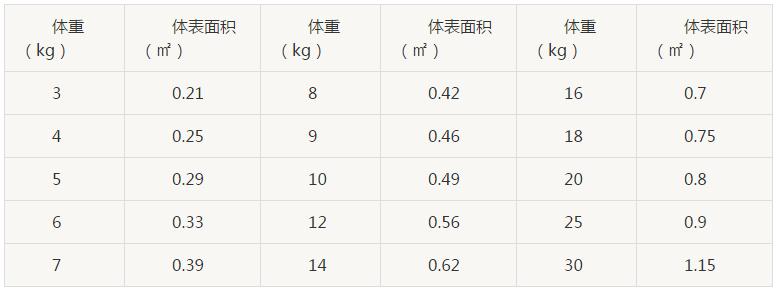 如體重≤30kg,小兒體表面積(m2)=(體重×0.035)+0.1。