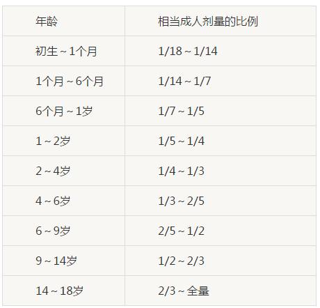 按下列年齡折算比例表折算,總的趨勢是劑量偏小,然而較安全,下表可供參考。