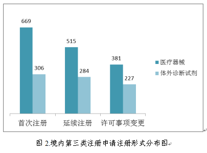 從注冊形式看,首次注冊975項,占全部境內(nèi)第三類醫(yī)療器械注冊申請數(shù)量的41.0%;延續(xù)注冊799項,占全部境內(nèi)第三類醫(yī)療器械注冊申請數(shù)量的33.5%;許可事項變更608項,占全部境內(nèi)第三類醫(yī)療器械注冊申請數(shù)量的25.5%。注冊形式分布情況見圖2。