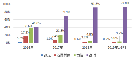 2016年以來,化妝品輿情數(shù)據(jù)傳播平臺占比情況如圖4所示,以微博、微信為代表的新媒體平臺成為輿情來源主渠道,特別是社交媒體平臺數(shù)據(jù)量2018年已占到九成以上。