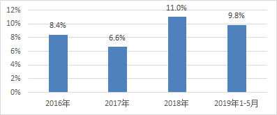 如圖1所示,從化妝品數(shù)據(jù)來看,相比2016年、2017年,2018年整體數(shù)據(jù)量顯著增多,其中,“自制中藥口紅安全存隱患”“進口非特備案試點擴大”等議題受到較高關(guān)注。2019年1~5月數(shù)據(jù)量相比2018年同時段也有大幅增漲,“化妝品汞含量超標(biāo)萬倍”“故宮彩妝因質(zhì)量不佳停產(chǎn)”“多款寶寶霜被指含激素”等熱點事件熱議度較高,加之化妝品監(jiān)督管理條例今年有望出臺,預(yù)計2019年化妝品關(guān)注度將超過2018年。從化妝品在藥械化整體輿情數(shù)據(jù)量占比來看(圖2),2018年首次突破10%,2019年1~5月達到9.8%。