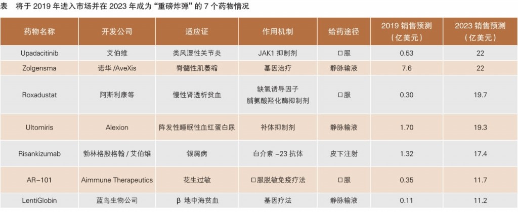 科睿唯安的Cortellis團隊日前發(fā)布報告,預測2019年度最值得關(guān)注的藥物有7個(見表),它們上市后5年內(nèi)的銷售額有望達到“重磅炸彈”級別(達到或超過10億美元)。