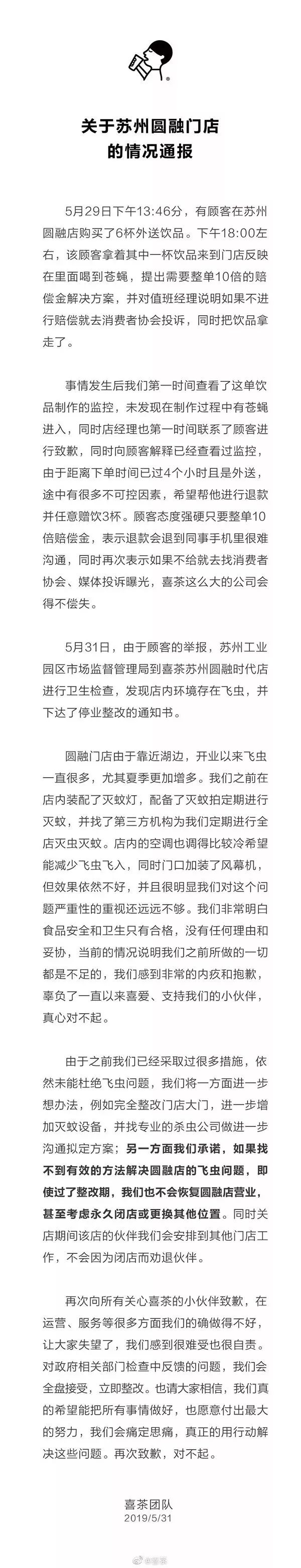 5月31日19時,深圳喜茶投資有限公司官微@喜茶對蘇州圓融店具體情況進(jìn)行了通報,并向廣大消費者道歉。喜茶方面表示,第一時間查看相關(guān)監(jiān)控后,未發(fā)現(xiàn)制作過程中有蒼蠅進(jìn)入,由于上述顧客的購買方式為外送且已過4小時,“途中有很多不可控因素”。喜茶同時認(rèn)為,食品安全和衛(wèi)生只有合格,沒有任何理由和妥協(xié)。如果找不到有效的方法解決圓融店的飛蟲問題,就不會恢復(fù)圓融店營業(yè)甚至考慮永久閉店或更換其他位置。對政府相關(guān)部門檢查中反饋的問題,會全盤接受立即整改。界面新聞、東方財富網(wǎng)等新聞網(wǎng)站,@每日經(jīng)濟(jì)新聞、@ 36氪等微博賬號均轉(zhuǎn)載了相關(guān)信息。少量網(wǎng)民對喜茶的道歉并不認(rèn)可,認(rèn)為喜茶是在找借口。