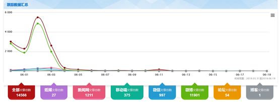 以5月31日~6月19日為監(jiān)測時間段,輿情出現(xiàn)兩個峰值,網(wǎng)民關(guān)注度遠(yuǎn)高于媒體關(guān)注度。