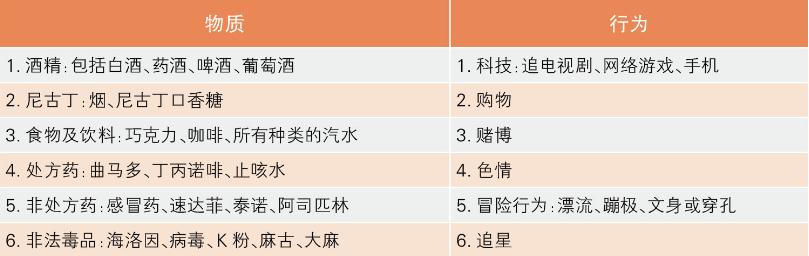 美國(guó)著名的治療成癮的心理治療師弗雷德里克·沃爾夫頓在其著作中總結(jié)了其在多年的成癮心理治療工作中見(jiàn)到的、常被濫用的物質(zhì)及行為(詳見(jiàn)下表),這些在我們國(guó)內(nèi)的成癮治療工作也經(jīng)常碰到。