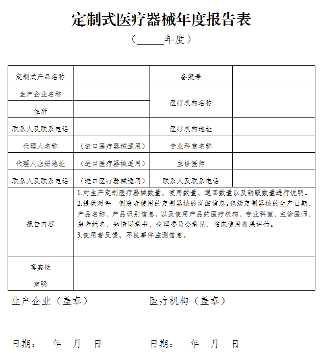 第十八條 每年1月底前,備案人應(yīng)當(dāng)向所在地省、自治區(qū)、直轄市藥品監(jiān)督管理部門和衛(wèi)生健康行政部門報(bào)告上一年度定制式醫(yī)療器械的生產(chǎn)和使用年度報(bào)告(見附4)。