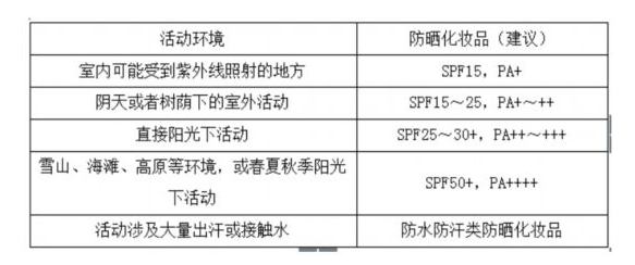 為了全面防護(hù),要選擇既能防護(hù)UVB又能防護(hù)UVA的防曬化妝品,即產(chǎn)品標(biāo)簽標(biāo)識有SPF值和PA等級或廣譜防曬的產(chǎn)品。那么是不是直接購買SPF值最大,PA“+”最多的防曬化妝品就最好呢?其實(shí)不然。雖然SPF值越大、PA“+”越多的產(chǎn)品防曬效果越好,但同時也意味著添加的防曬劑含量越高或者成分越復(fù)雜,過度使用會加重皮膚的負(fù)擔(dān),甚至還可能引起皮膚不良反應(yīng)。因此應(yīng)根據(jù)環(huán)境條件選用防曬化妝品,具體情況可參考下表。