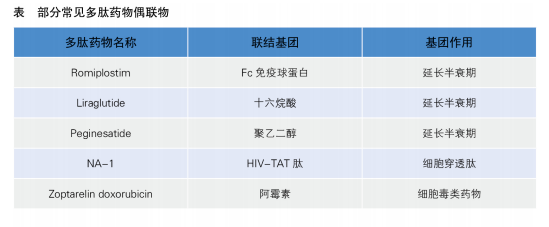 其中,共軛聯(lián)結(jié)基團(tuán)已成為改變多肽藥物性質(zhì)的重要手段。從2010年起,全球約有30%處在臨床試驗(yàn)階段的多肽藥物是結(jié)合物,比如與聚乙二醇、脂質(zhì)和蛋白質(zhì)等結(jié)構(gòu)偶聯(lián)。研究證明,綴合Fc片段能延長多肽半衰期,多肽藥物偶聯(lián)物還能用作細(xì)胞毒性劑的有效載荷和傳遞物(部分常見多肽藥物偶聯(lián)物見表)。