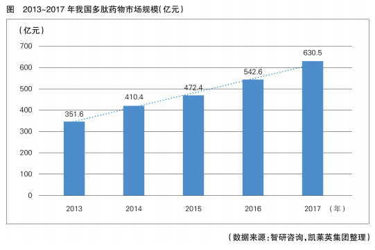 據(jù)中國產(chǎn)業(yè)調(diào)研網(wǎng)發(fā)布的《2019~2025年中國多肽藥物行業(yè)發(fā)展研究分析與發(fā)展趨勢(shì)預(yù)測(cè)報(bào)告》,我國近年來多肽藥物市場規(guī)模同樣呈上升趨勢(shì),2017年達(dá)到630.5億元(見圖),這要?dú)w因于我國人口基數(shù)大、老齡化加劇,存在大量的腫瘤及慢性病患者。預(yù)計(jì)未來這一市場需求將不斷擴(kuò)大,多肽藥物仍有大幅增長空間。