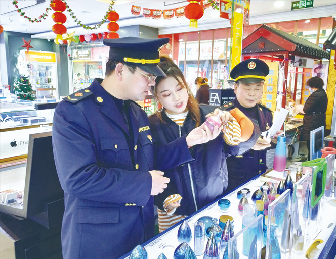 圖為執(zhí)法人員在超市化妝品專柜檢查化妝品標(biāo)簽標(biāo)識(shí)情形。鄢國(guó)卿 袁智 攝影報(bào)道