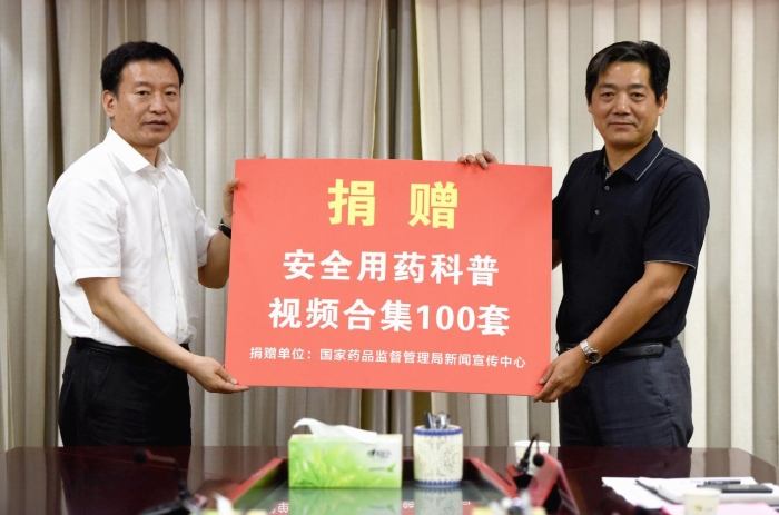 圖為國家藥品監(jiān)管局新聞宣傳中心副主任趙北海(左)向臨泉縣衛(wèi)生健康委員會(huì)捐贈(zèng)安全用藥科普視頻合集。記者蔣守福 攝