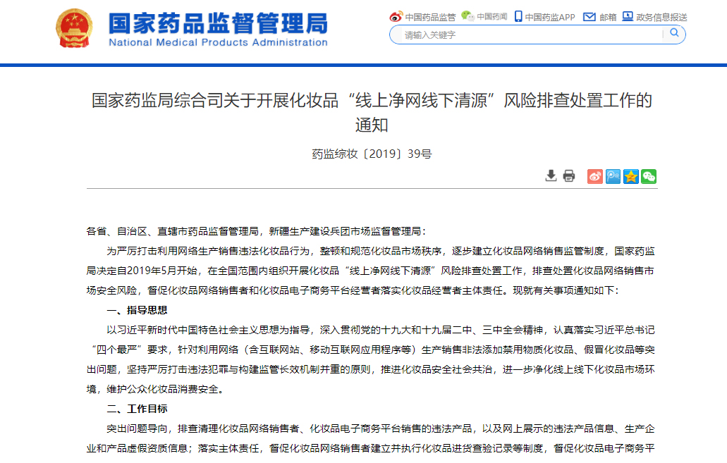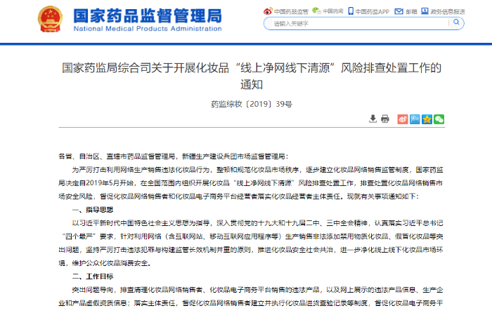 2019年4月30日,國家藥監(jiān)局官網(wǎng)發(fā)布通知,在全國范圍內部署開展“線上凈網(wǎng)線下清源”風險排查處置工作,排查處置化妝品網(wǎng)絡銷售市場安全風險,整頓和規(guī)范化妝品市場秩序,逐步建立化妝品網(wǎng)絡銷售監(jiān)管制度。