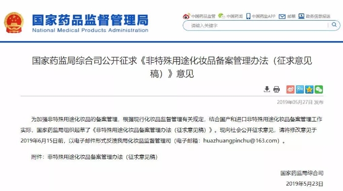2019年5月27日,國家藥監(jiān)局發(fā)布《非特殊用途化妝品備案管理辦法(征求意見稿)》(以下簡稱《征求意見稿》)公開征求意見?!墩髑笠庖姼濉吠瑫r適用于國產和進口的非特殊用途化妝品備案管理工作。《征求意見稿》不僅將平臺上傳所需的國產非特化妝品備案資料增至八項,做到與進口產品基本一致,還統(tǒng)一了國產和進口產品備案流程要求?!墩髑笠庖姼濉芬筇峁┤吭虾?,并按含量遞減順序排列。《征求意見稿》強調了產品安全性,要求應當按照可能存在的安全性風險物質風險評估指南和產品安全評價指南等相關要求進行安全風險評估,形成產品安全評價報告。根據(jù)《征求意見稿》,藥品監(jiān)督管理部門將推行量化分級管理制度,重點加強對量化評分分值較低的企業(yè)及其產品的監(jiān)督檢查。