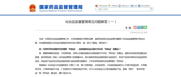 2019年1月10日,國家藥監(jiān)局官網(wǎng)發(fā)布化妝品監(jiān)督管理常見問題解答(以下簡稱“問題解答”),回應業(yè)界關注的能否使用藥妝品概念、表皮生長因子(EGF)能否作為化妝品原料使用等問題。