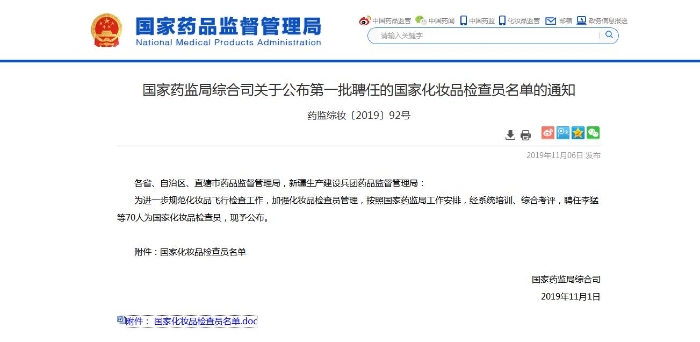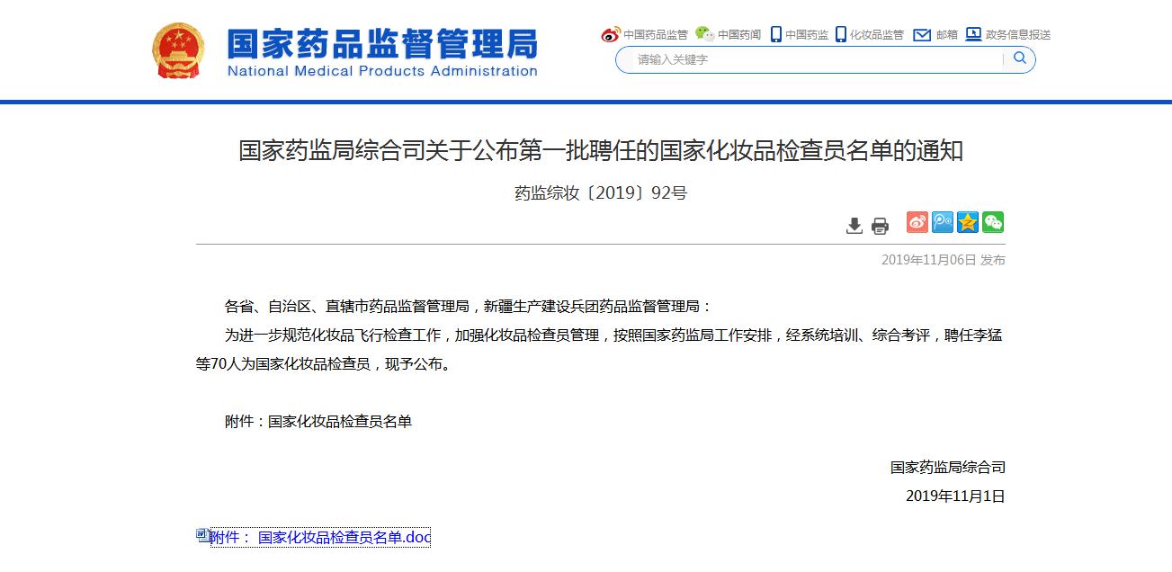 2019年11月6日,國家藥監(jiān)局官網(wǎng)發(fā)布通知,公布第一批聘任的國家化妝品檢查員名單。經過系統(tǒng)培訓、綜合考評,來自國家、部分省市級和地市級藥品監(jiān)管部門,以及部分省級、地市級食品藥品檢驗檢測機構,省級藥品審評機構、技術審評核查機構、藥品評價機構中心和大專院校共計70名人員被聘任為國家化妝品檢查員。主要承擔特殊用途化妝品研發(fā)過程現(xiàn)場檢查;承擔化妝品境外現(xiàn)場檢查以及生產環(huán)節(jié)重大有因檢查。