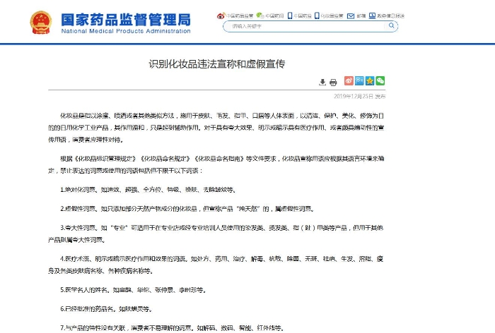 2019年12月25日,國家藥監(jiān)局官網(wǎng)發(fā)布《識別化妝品違法宣稱和虛假宣傳》,明確了化妝品的定義,強調對于具有夸大效果、明示或暗示具有醫(yī)療作用、或者頗具煽動性的宣傳用語,消費者應理性對待。