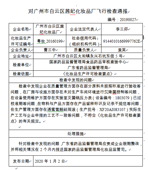 飛檢通報(bào):對(duì)廣州市白云區(qū)茜妃化妝品廠飛行檢查通報(bào)