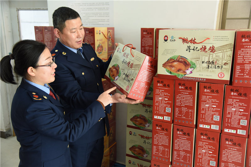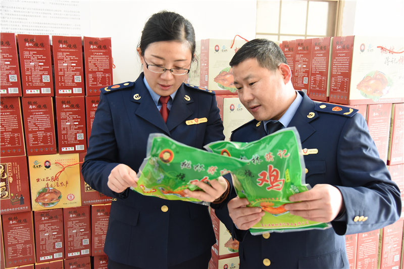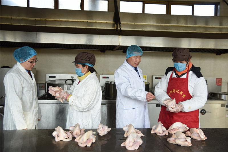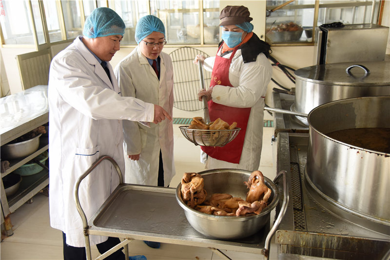 東??h市場監(jiān)管局行政執(zhí)法人員正在對鹵肉食品年貨進行質(zhì)量把關(guān)。(張正友 攝)