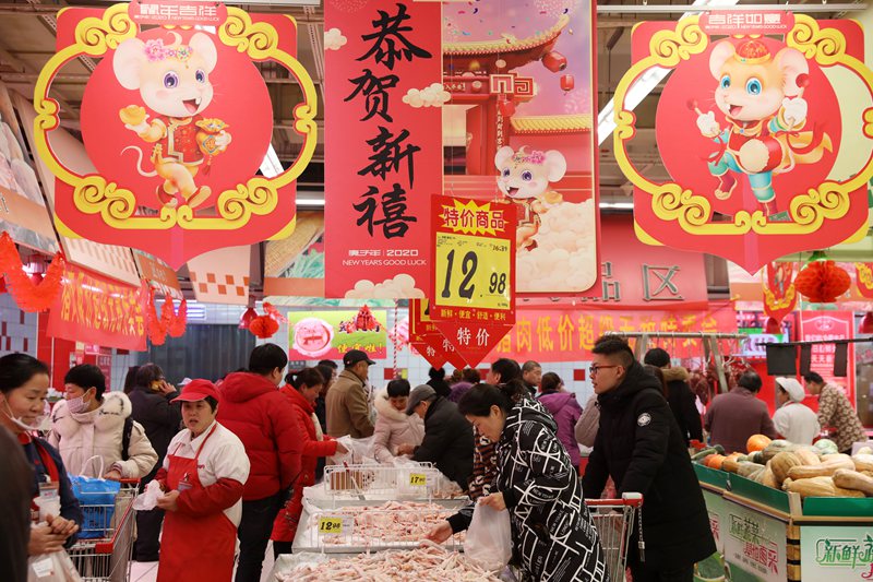 2020年1月18日,市民在安徽省淮北市購(gòu)物超市年貨大街上選購(gòu)商品。(李鑫 攝)