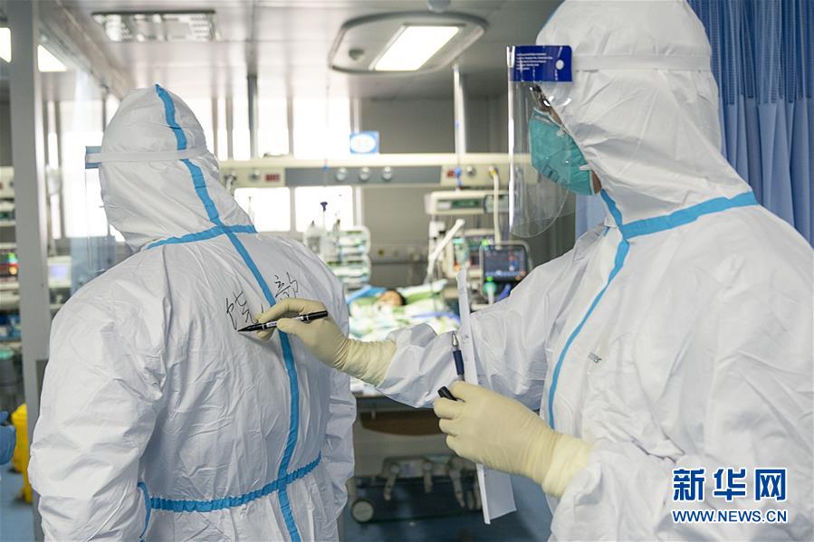1月24日,在武漢大學(xué)中南醫(yī)院重癥隔離病房,醫(yī)護(hù)人員在隔離服上寫(xiě)下名字,方便辨認(rèn)。新華社記者 熊琦 攝