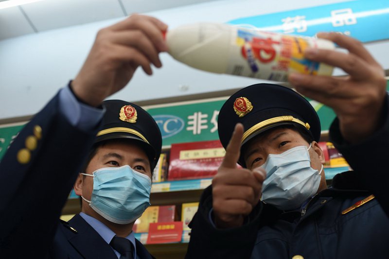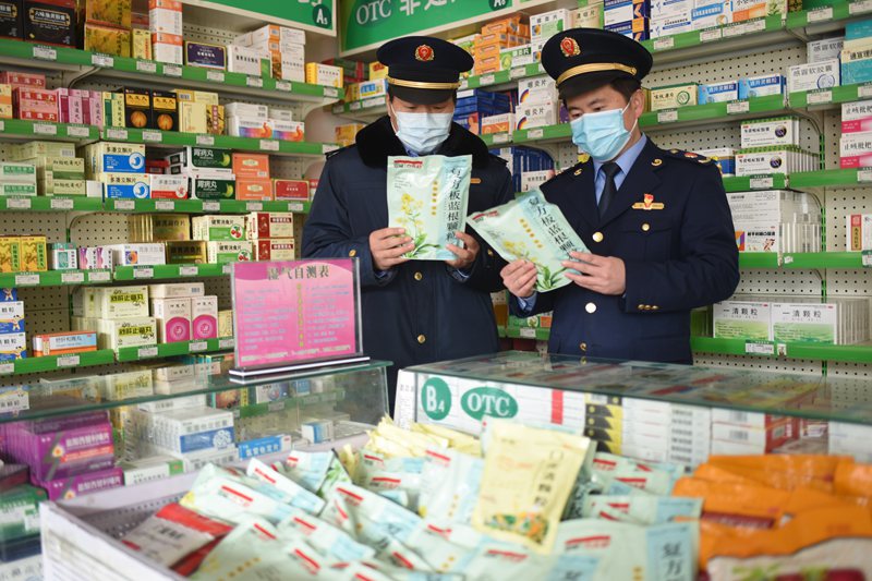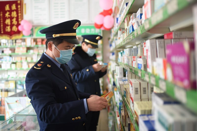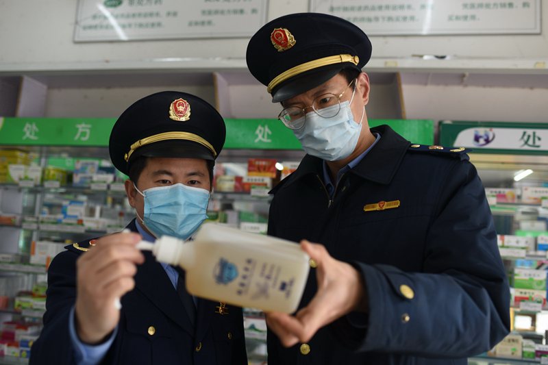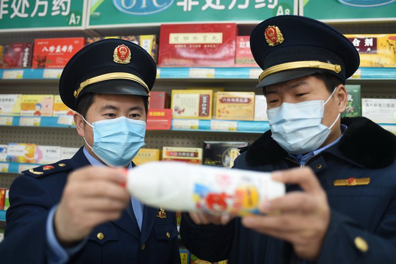 2020年2月7日,江蘇省連云港市東??h市場監(jiān)管局執(zhí)法人員正在青湖鎮(zhèn)一家藥店進(jìn)行質(zhì)量巡查。(張玲 董自李 攝)
