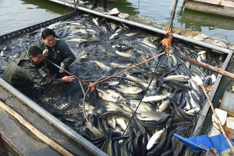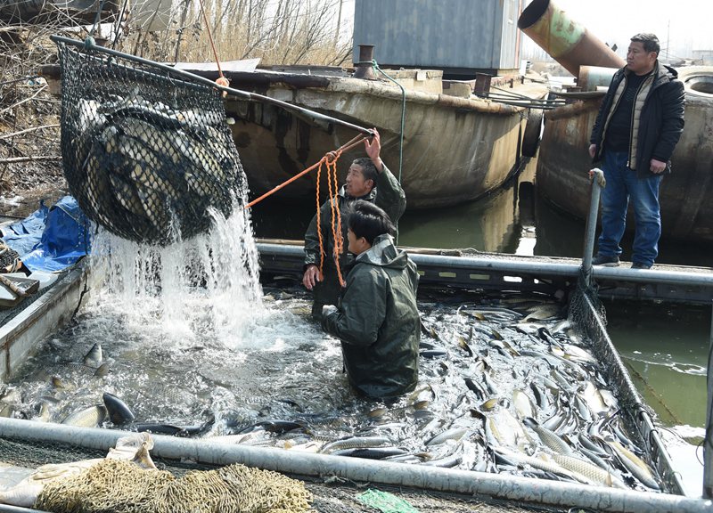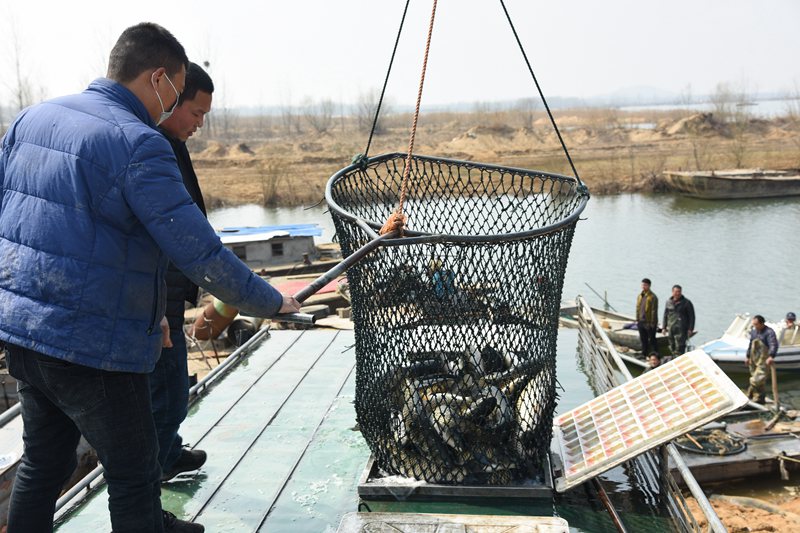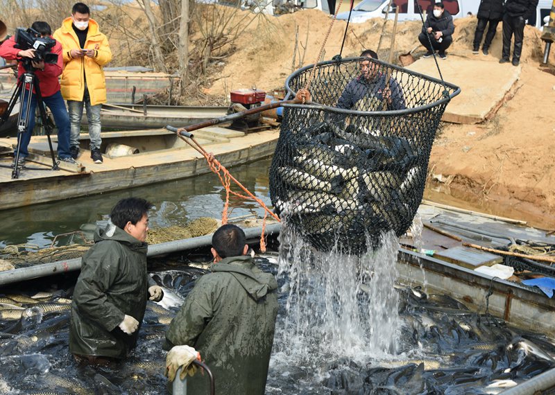 2020年3月3日,江蘇省連云港市東??h石梁河鎮(zhèn)海陵湖漁民正在起網(wǎng)捕獲草魚(yú)。(張正友 攝)