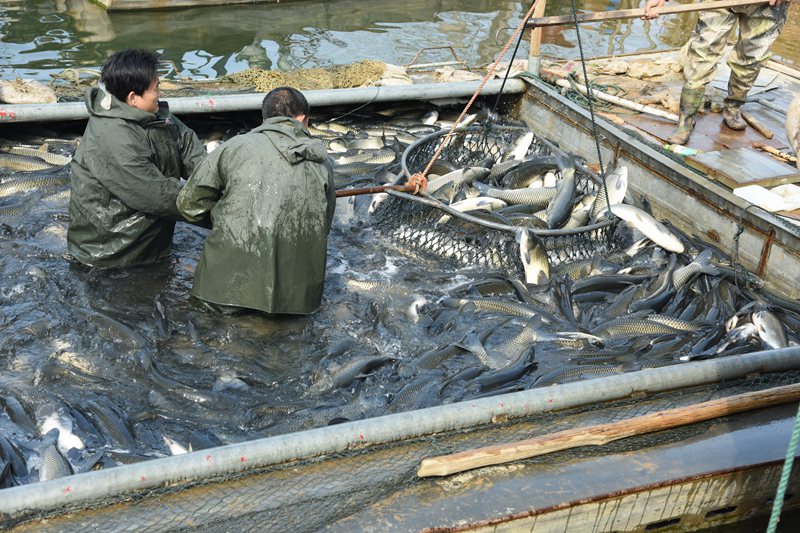 圖為東??h石梁河鎮(zhèn)海陵湖漁民正在銷(xiāo)售起網(wǎng)捕獲草魚(yú)。(張正友 攝)