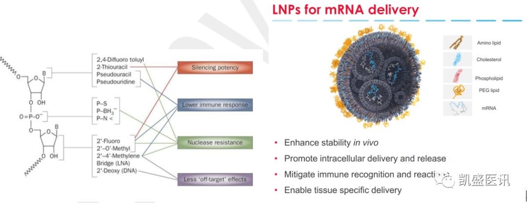 近些年來mRNA疫苗快速發(fā)展也是得益于RNA的修飾以及遞送技術(shù)的發(fā)展。以Moderna公司為例,其Nucleoside-modified mRNA極大的提高了mRNA的穩(wěn)定性,且能夠調(diào)節(jié)mRNA藥物在體內(nèi)的半衰期;納米脂質(zhì)體顆粒能夠?qū)RNA包裹在內(nèi),進一步提高穩(wěn)定性,也能夠高效地完成mRNA的細胞內(nèi)遞送。(作者單位:凱盛融英信息科技(上海)股份有限公司)