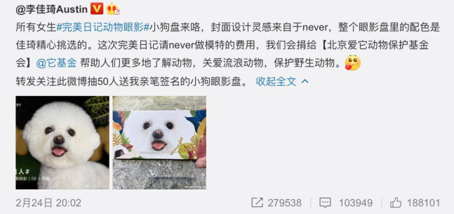 對話題營銷駕輕就熟的完美日記沒有被疫情束縛,與李佳琦合作,由其愛寵代言,推出全新動物眼影盤系列,在賺足眼球的同時,也成就了產(chǎn)品的銷售熱潮。2月25日零點,小狗眼影盤在李佳琦直播間全網(wǎng)首發(fā),數(shù)秒內(nèi)15萬盤眼影被搶購一空;3月5日,小狗眼影盤正式開售,30萬盤產(chǎn)品被迅速搶光。