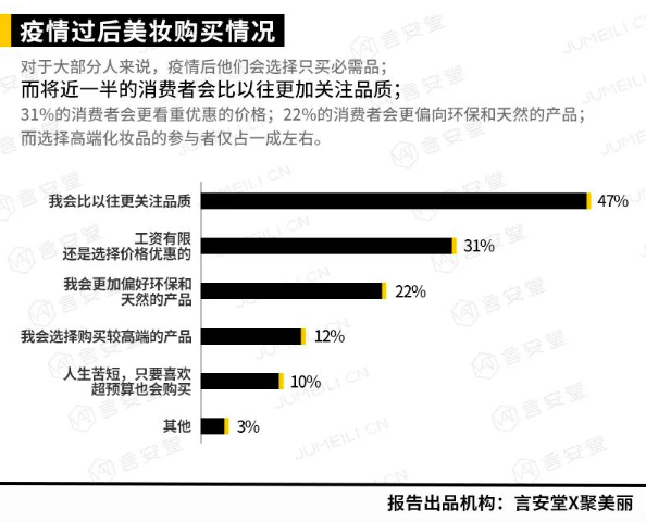 第一,健康、安全是疫情過后的營銷關(guān)鍵詞。聚美麗《新型冠狀病毒疫情影響下美妝消費調(diào)研》報告中顯示,疫情過后,安全意識仍將長期影響消費者的購物行為,美妝消費趨于理性,用戶最關(guān)注的是產(chǎn)品品質(zhì),性價比、天然環(huán)保次之。針對這一心理特征,美妝品牌營銷應(yīng)避免純情感、煽情式營銷,可加重理性營銷比重,借助產(chǎn)品科技宣傳、第三方安全測試等事實營銷手法,打消用戶心中的品質(zhì)與安全的疑慮,說服用戶購買體驗。