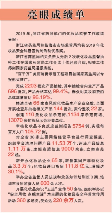 2019年,浙江省藥品監(jiān)管部門嚴(yán)防嚴(yán)控化妝品安全風(fēng)險(xiǎn),創(chuàng)新探索監(jiān)管方式,規(guī)范化妝品行業(yè)發(fā)展;持續(xù)深化改革,優(yōu)化服務(wù),健全監(jiān)管體系,提高監(jiān)管能力水平,化妝品監(jiān)管工作取得新成效。2019年,浙江省化妝品監(jiān)督抽檢合格率達(dá)99.4%,群眾對(duì)美妝消費(fèi)的總體滿意度達(dá)96.19%?!罢惝a(chǎn)美妝”站上全國(guó)化妝品產(chǎn)業(yè)發(fā)展第一方陣。