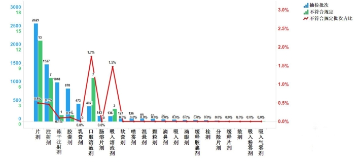 抽檢數(shù)據(jù)顯示,口服制劑產(chǎn)品的不符合規(guī)定批次占比較高(見圖9),提示有關企業(yè)應加強全過程質量控制,加強購進藥材和原輔料的質量管理,應嚴格控制生產(chǎn)工藝關鍵步驟,提高工藝穩(wěn)定性,優(yōu)化包裝條件等。