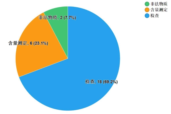 不符合規(guī)定項目主要集中在檢查與含量測定兩項。不符合規(guī)定產(chǎn)品數(shù)量依次為18和6批次,分別占全部不符合規(guī)定項目的69.2%和23.1%(見圖8)。