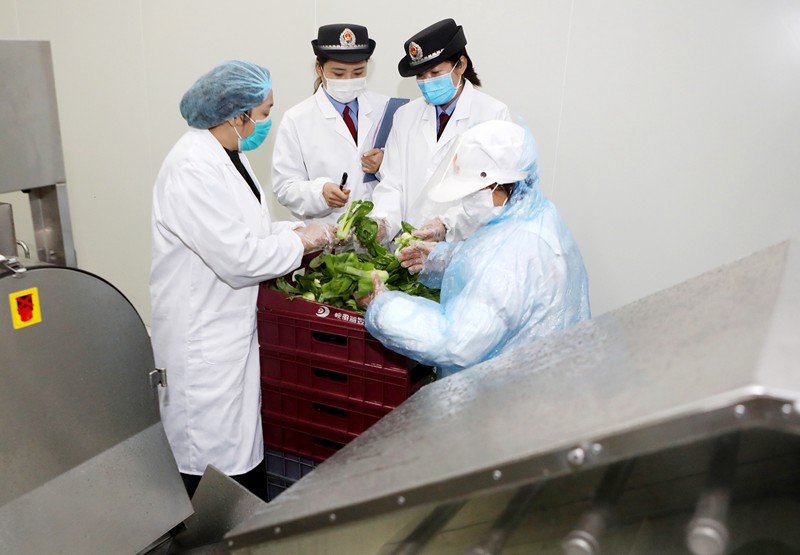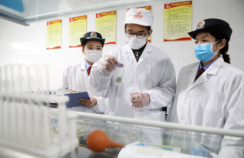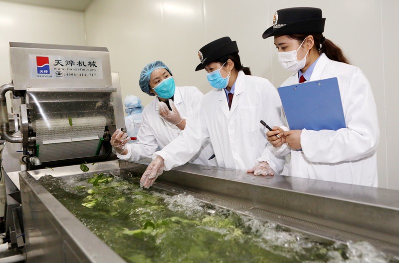 在檢查現(xiàn)場(chǎng),工作人員對(duì)企業(yè)農(nóng)殘檢測(cè)進(jìn)行指導(dǎo)。(李鑫??朱朝鳳 攝)