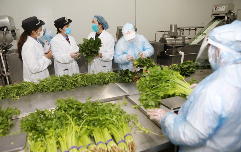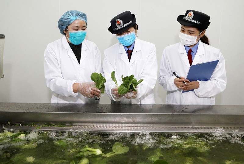 2020年3月31日,安徽省淮北市鳳凰山經(jīng)濟(jì)開發(fā)區(qū)市場(chǎng)監(jiān)管分局工作人員,在轄區(qū)線上平臺(tái)生產(chǎn)銷售蔬菜的企業(yè)進(jìn)行檢查。(李鑫??朱朝鳳 攝)