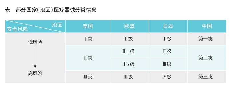 縱觀發(fā)達(dá)國(guó)家對(duì)醫(yī)療器械的監(jiān)管,普遍采取按照風(fēng)險(xiǎn)程度區(qū)別管理的措施,部分國(guó)家(地區(qū))醫(yī)療器械分類(lèi)情況見(jiàn)表。