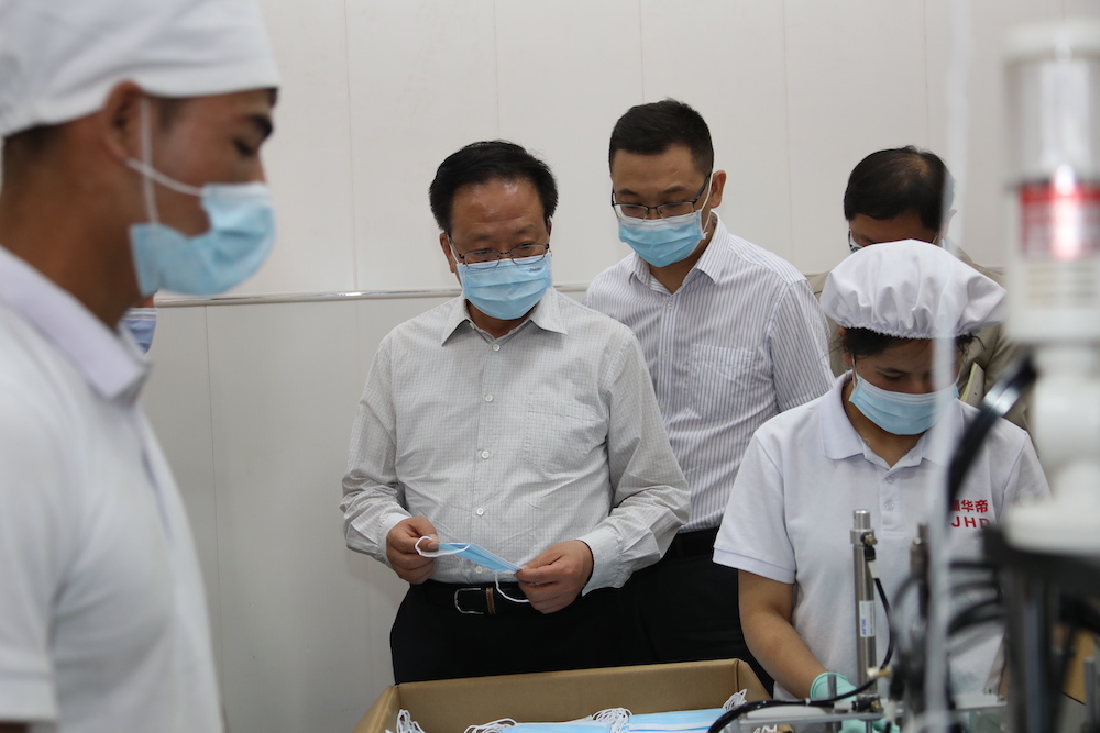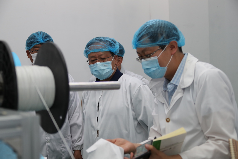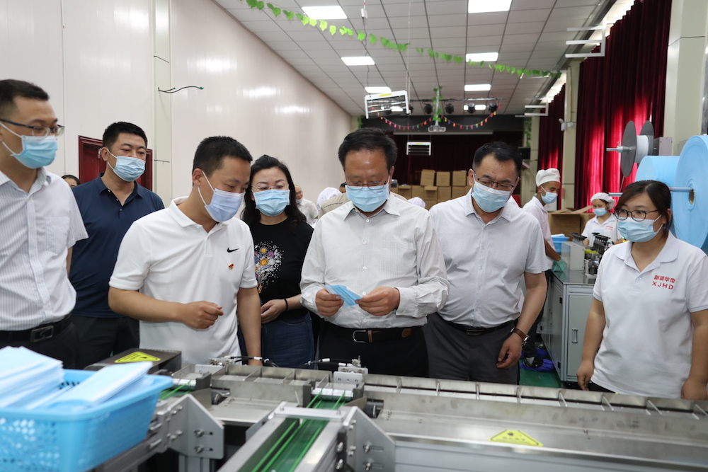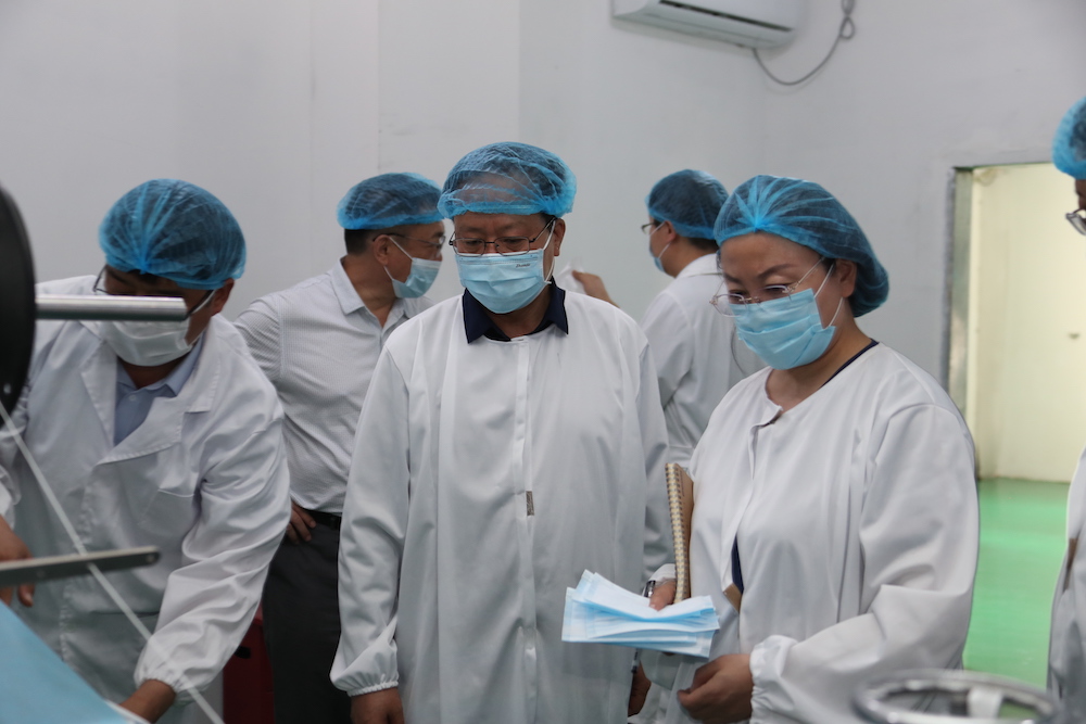 新疆維吾爾自治區(qū)藥監(jiān)局黨組書記、局長張鈺祥(中)帶隊(duì)赴吐魯番市調(diào)研口罩生產(chǎn)企業(yè)。(馬少賓 攝)