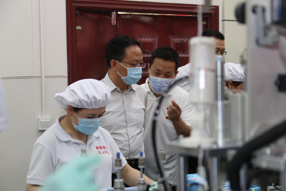 新疆維吾爾自治區(qū)藥監(jiān)局黨組書記、局長張鈺祥(右)帶隊(duì)赴吐魯番市調(diào)研口罩生產(chǎn)企業(yè)。(馬少賓 攝)