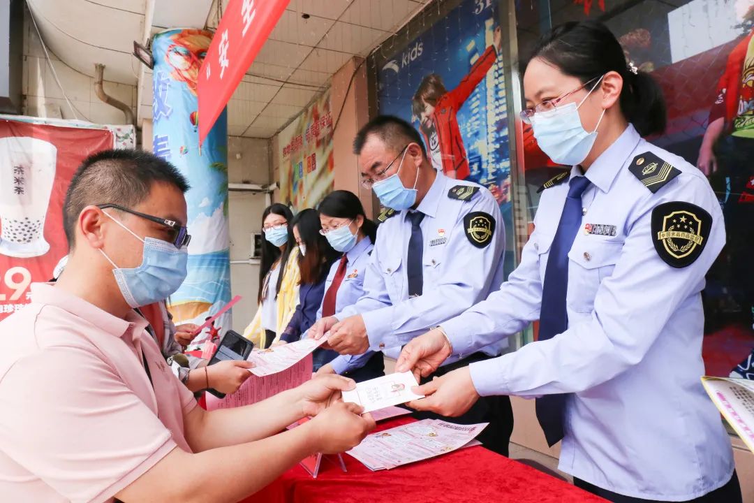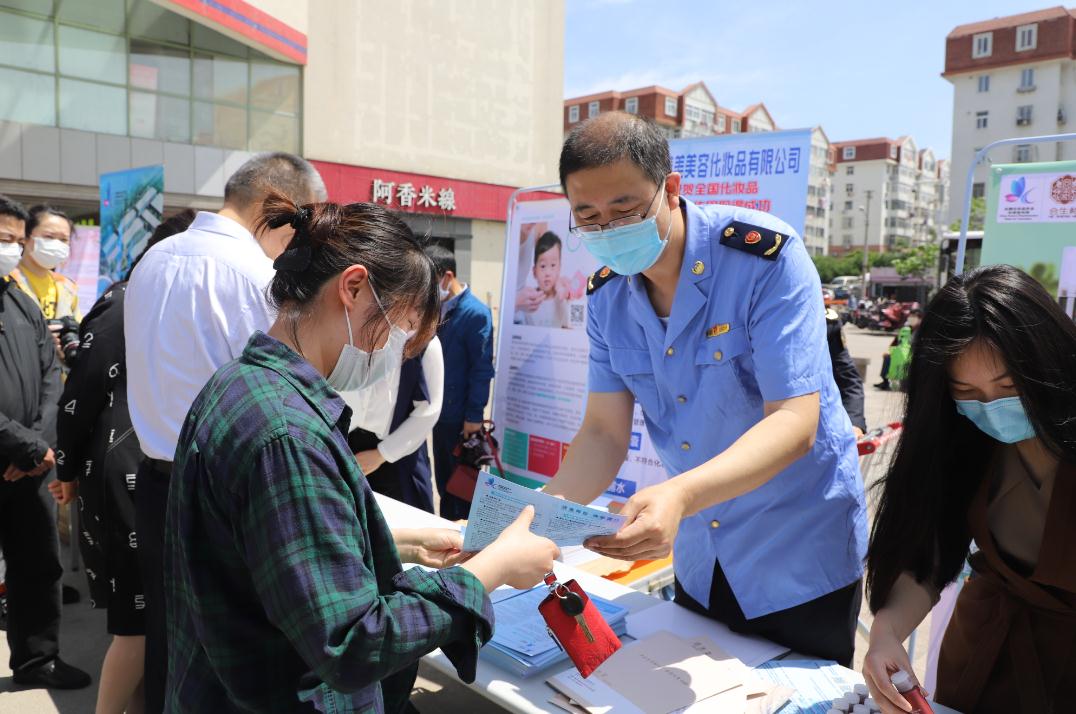 淄博市市場監(jiān)管局監(jiān)管人員向群眾發(fā)放化妝品安全相關(guān)知識。(山東省藥監(jiān)局供圖)