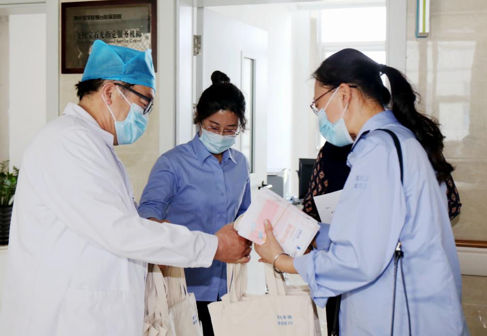 煙臺市牟平區(qū)市場監(jiān)管局工作人員前往當(dāng)?shù)夭涣挤磻?yīng)哨點(diǎn)醫(yī)院發(fā)放宣傳手冊,并與該院皮膚科大夫就化妝品不良反應(yīng)相關(guān)工作進(jìn)行溝通。(山東省藥監(jiān)局供圖)