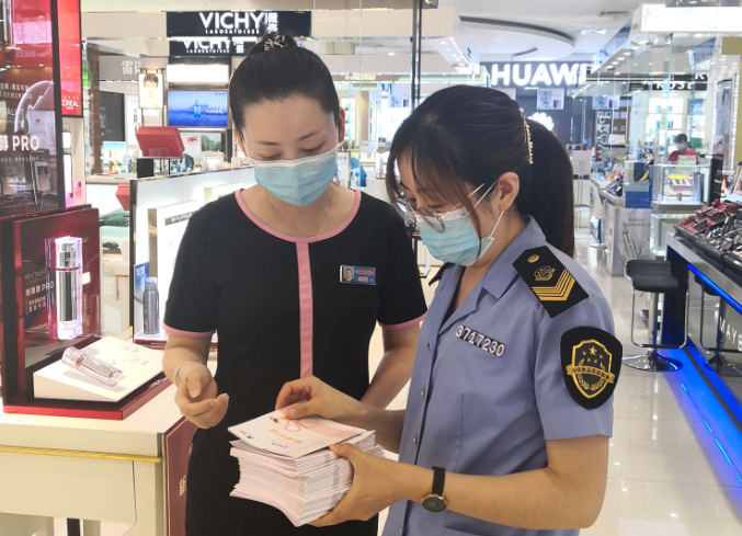 淄博市市場監(jiān)管局監(jiān)管人員向化妝品經(jīng)營者介紹化妝品科普知識。(山東省藥監(jiān)局供圖)