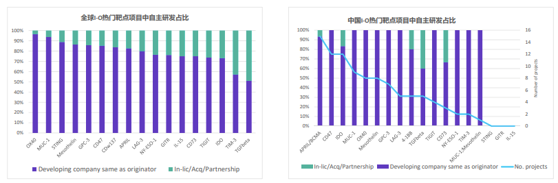 中國(guó)公司強(qiáng)調(diào)自主研發(fā),78%的熱門(mén)靶點(diǎn)項(xiàng)目都是由發(fā)起該項(xiàng)目的同一家公司開(kāi)發(fā),僅7%來(lái)自合作。聯(lián)合用藥成為大趨勢(shì),所有靶點(diǎn)均聯(lián)用PD1/L1抑制劑,另有一半聯(lián)用CTLA-4。