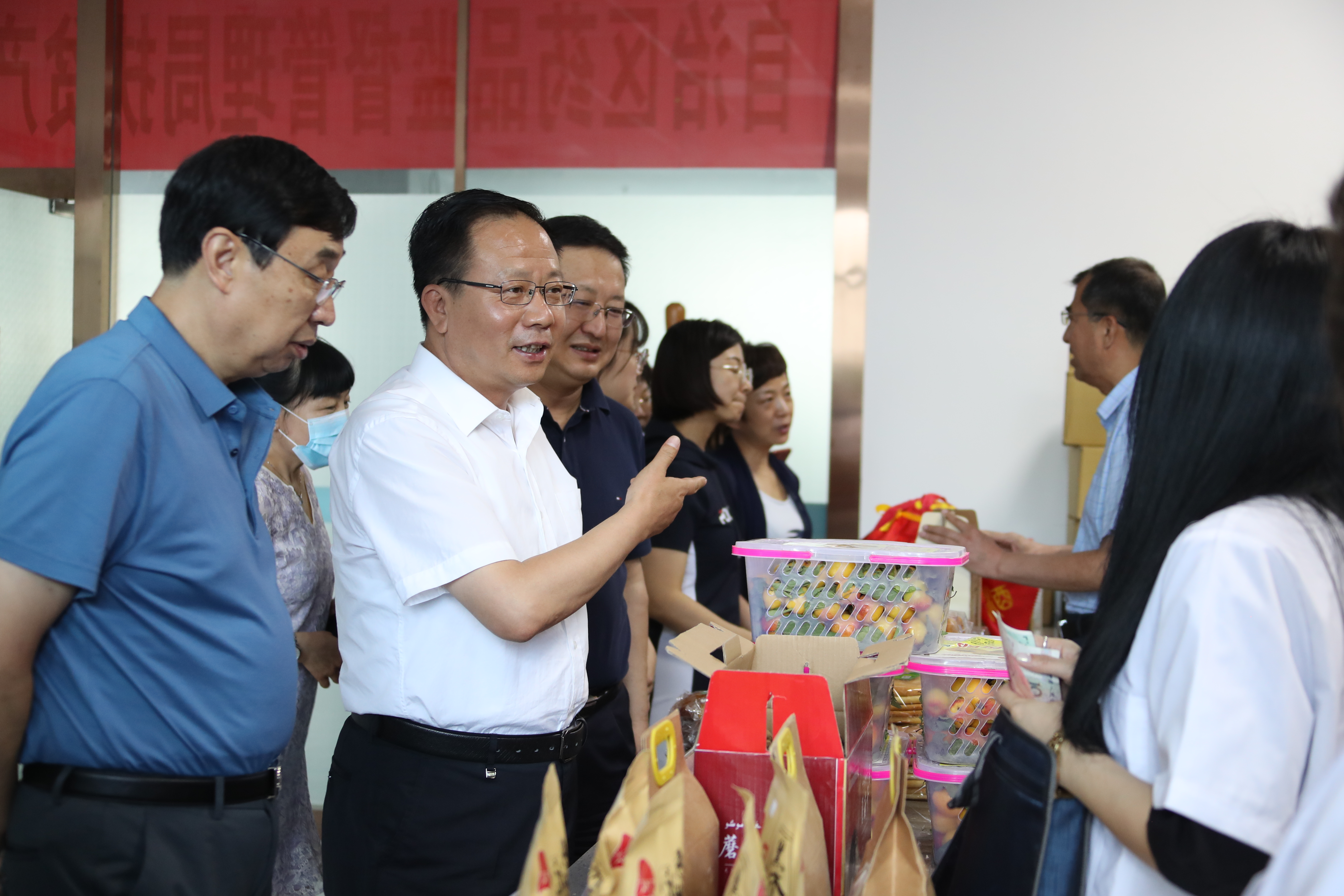 圖為新疆維吾爾自治區(qū)藥監(jiān)局黨組書(shū)記、局長(zhǎng)張鈺祥(前左二)等局領(lǐng)導(dǎo)參加扶貧產(chǎn)品展銷會(huì)。(馬少賓 攝)