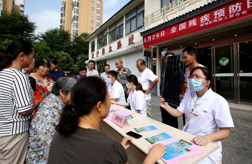 圖為8月25日,嶧城區(qū)殘疾人聯(lián)合會(huì)組織醫(yī)務(wù)人員在當(dāng)?shù)氐闹嗅t(yī)院進(jìn)行義診宣傳。(吉喆 攝)